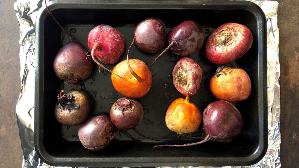 Leave to cool under the foil and then you can slide off the skins with your fingers, or scrape with the back of a knife, but do remember to keep the more traditional deep-pink beets separately from any golden or chioggia varieties, as they will bleed. Oh, and a word on those amazing candy-striped chioggia – they lose their stripes as they cook, so I tend to keep them for raw salads.