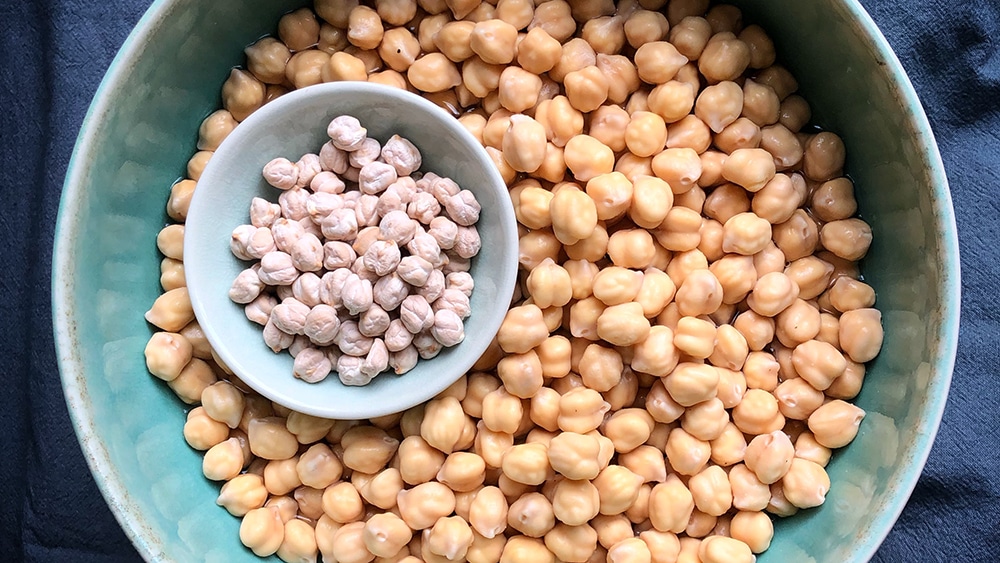 Cooking up a pot of pulses – in this case, chickpeas – is an absolute no-brainer if you’re wanting to get ahead with the building blocks for a few meals. And there’s the added bonus that any surplus pulses can be frozen in small quantities for quick fixes at a later date.