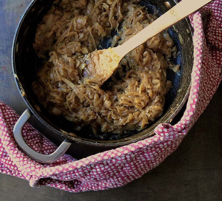 Cooking the onions until golden and caramelised in a little butter or olive oil is pure alchemy, but it does take around 45 minutes to an hour and so, I take my largest sauté pan (a heavy frying pan will do) and cook around three kilos of onions in one go and I’m set up for any number of meals.