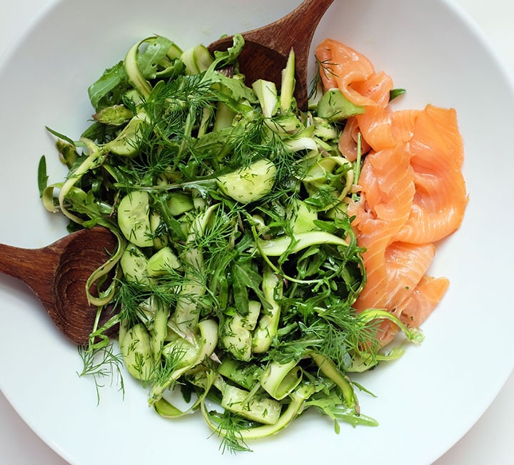 The dill made me think of the Severn and Wye smoked salmon at Shellseekers Fish & Game, which would provide a necessary dash of pink and a contrasting flavour and texture. The asparagus and greens still star, but the addition of this fish turns the dish from a side salad to a light lunch that’ll feed at least two – possibly more if you add some fresh sourdough and maybe some other cold cuts or platters, picked up at the same time. In terms of assembly, you can pretty much do what you want, though I suggest peeling and then chunking the cucumbers and letting them sit in a little olive oil, half the lemon juice, sugar, salt, white pepper and chopped dill while you prepare the rest of the salad. Let the shaved asparagus (and any chunky bits that can’t be shaved) sit in the remaining lemon juice and more olive oil, and mix the rocket through that at the last minute. Transfer to a platter, scatter over the marinated cucumbers, then more dill fronds over the top.