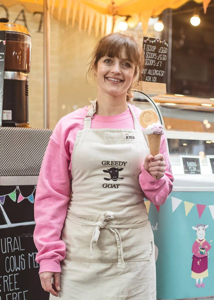 Back at Greedy Goat, Josie creates seasonal fruit flavours, making the most of any gluts. When 13 Acre Orchard had an abundance of English plums, she turned them into sticky plum and ginger ice cream. “They couldn’t sell the plums quickly enough. I was able to cook them down, freeze it, then add it to the ice cream when I was ready. Working with traders is all about being creative but also the opportunity to reduce waste, which has been super cool.”