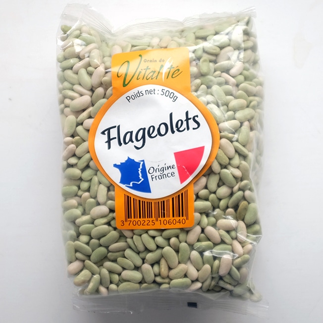 Flageolet beans are immature haricot beans, harvested before they’re ripe and dried in the shade to maintain their green tint. Theoretically, they can be used more off the cuff than other dried beans – their youthful shell apparently requiring only a couple of hours’ soaking in just boiled water, but I’ve found an overnight soak leads to a swifter simmer.