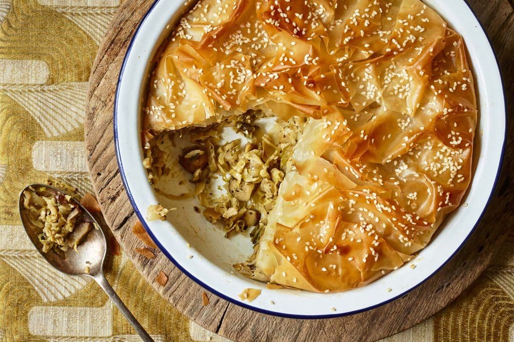 A filo pie filled with leftover vegetables makes the perfect centrepiece for any vegan guests over the festive period. This recipe has a shattering, crackling pastry exterior, and rich savoury veg-packed filling. Brindisa’s cooked sweet chestnuts are perfect here – grown in Galicia, Spain’s mecca for chestnuts, they have a sweet, intensely nutty flavour and rich, buttery texture. Alternatively, try the roasted Kentish cobnuts from Food & Forest, with their grassy, hazelnutty bite. For something a little more unexpected, you could even add a pinch of lavender from Le Marché du Quartier, some finely grated lemongrass from Raya or even a sprinkle of za’atar from Arabica to the mix.