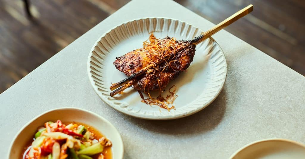 Andy: It’s a dish associated with the far south of Thailand. It’s incredibly delicious but not really known outside of Thailand. It’s based on coconut curry sauces – almost like a cousin of satay, but a bit more complex. The protein is dipped in the curry sauce and then repeatedly basted with it as it’s grilled. There’s lots of variety out there in the sauce, the technique and the proteins that are used. It’s most commonly chicken but it can be seafood – whole bits of fish or shellfish – and, particularly in southern Thai Muslim communities, meats like goat or mutton. Some of the sauces have lots of spices in them, making them almost Indian or Persian in their inflection. And others have no dried spice – it’s more like a classic Thai curry paste with lots of black pepper and lemongrass. It’s a whole family of dishes, and we’re going to be exploring it fully.