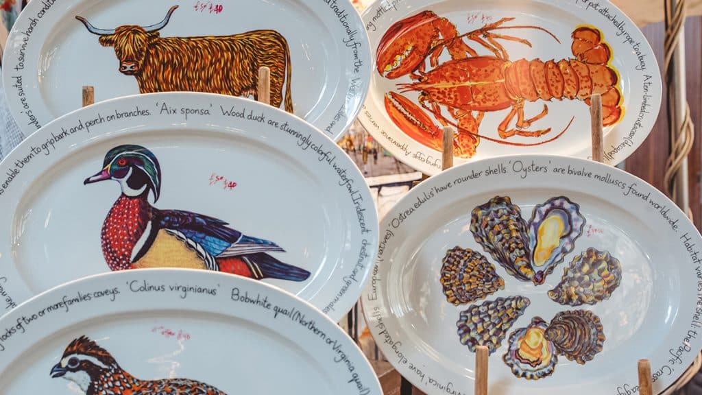 “For me, food, nature and art have always been the common threads,” says Richard Bramble, an artist whose stunning paintings of food adorn the ceramics, textiles and homewares sold at his Borough Market stand. “When I was young, our family holidays were spent in Poole Harbour fishing on a boat, or up in Scotland catching plaice or trout. We did the foraging thing. We picked mushrooms. We caught our supper and cooked it. That made its way into my art from an early age – even my pieces for A-level were of animals.”