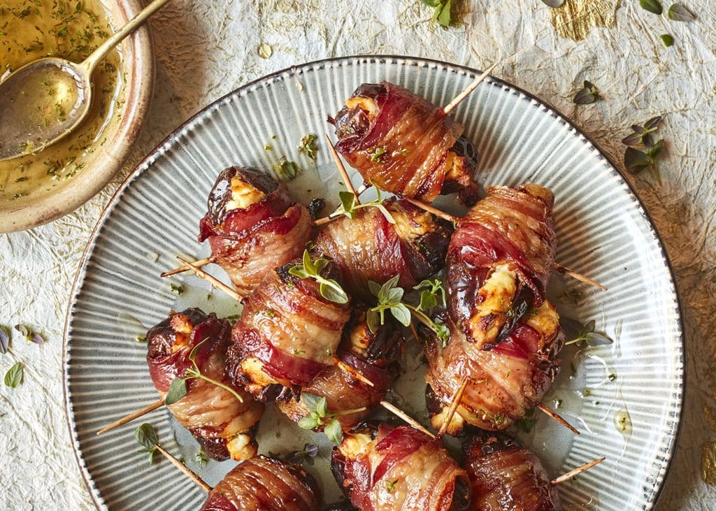 The ultimate party bite is something that hits every tastebud at the same time – sweet, savoury, salty and crunchy, all at once. These devils on horseback do just that. For the fruit element, Date Sultan’s premium medjool dates are succulent and juicy. For something a little chewier, the safawi or mabroom, both from Saudi Arabia, have toffee-caramel flavours and a rich dark colour. Alternatively, use dried apricots or figs. For the oozy filling, Blackwood Cheese Company’s Graceburn is perfect – a feta-inspired cheese with a creamier, more buttery texture. Greek wild flower honey sold at Oliveology, Ginger Pig’s smoked streaky bacon – marbled with fat that crisps up perfectly – and Food & Forest’s flavourful walnut kernels from Grenoble finish these morsels off a treat. Serve warm from the oven with champagne, crémant, franciacorta, or a bottle of something else suitably effervescent, ready to pop throughout the night!