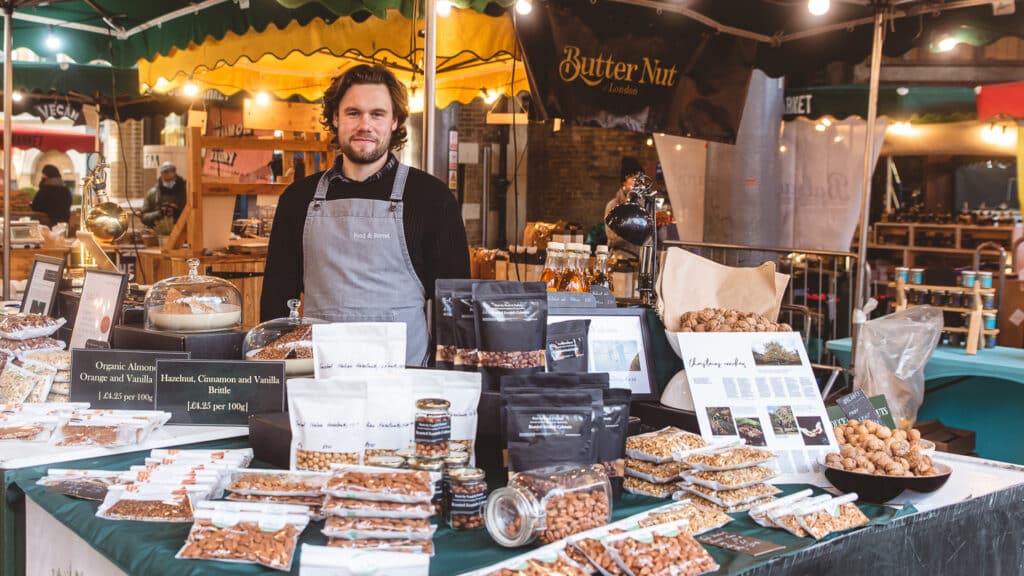 Some of the traders at Borough Market are practicing these regenerative forms of farming, including the Food & Forest nut stall, run by Charles Tebbutt. Food & Forest is a community interest company established to expand the use of agroforestry. In practice, this means creating the three key ingredients needed for alley cropping to flourish: demand for produce, production capacity, and a well-structured grant system.