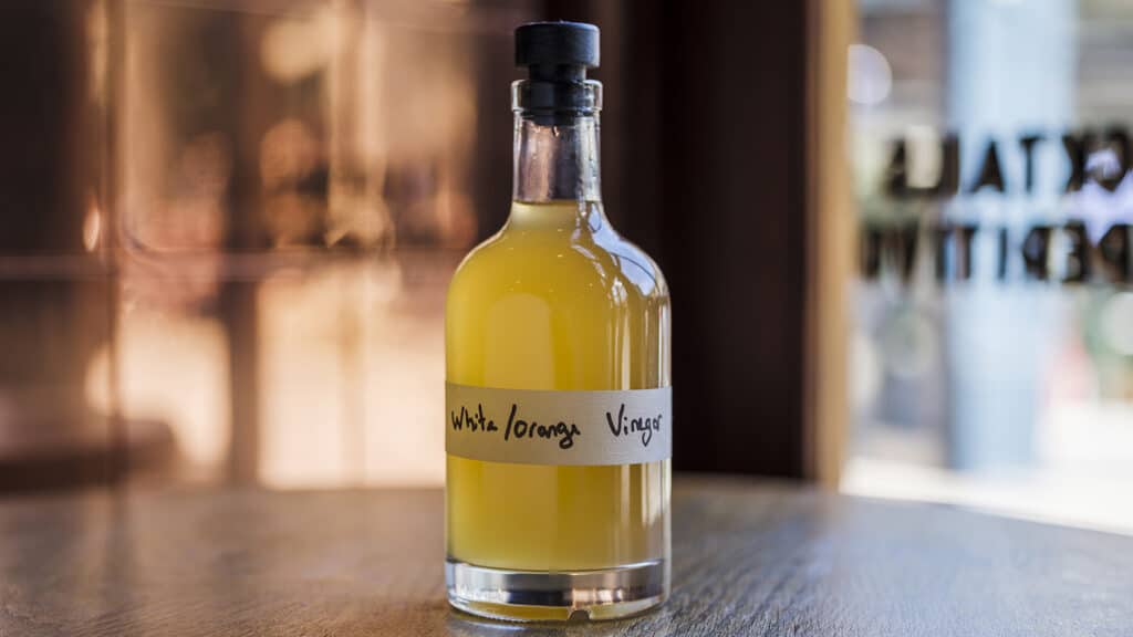 Ask for a soft drink in Elliot’s and you’ll be offered not a cola or a lemonade, but a shrub: a soft drink brewed with surplus fruit and wine-turned-vinegar (pictured top). “Any wine we have left over that can’t be served is oxidised and turned into drinking vinegar, and we use seasonal produce from the Market to infuse it. We have no other soft drinks or mixers, which also reduces our waste,” explains general manager Candice. They love pickles and ferments – as does Turnips, one of the Market’s greengrocers, for which waste reduction has become a core part of the business: what Turnips has dubbed a “two seasons” mentality on the stall. “Especially when we’re coming to the end of a season, when we get a big pile of, say, plums or peaches,” Gino at the stall tells me. “We can’t sell them all fresh in time, so we take some into the kitchen and turn them into ferments or sauces.”