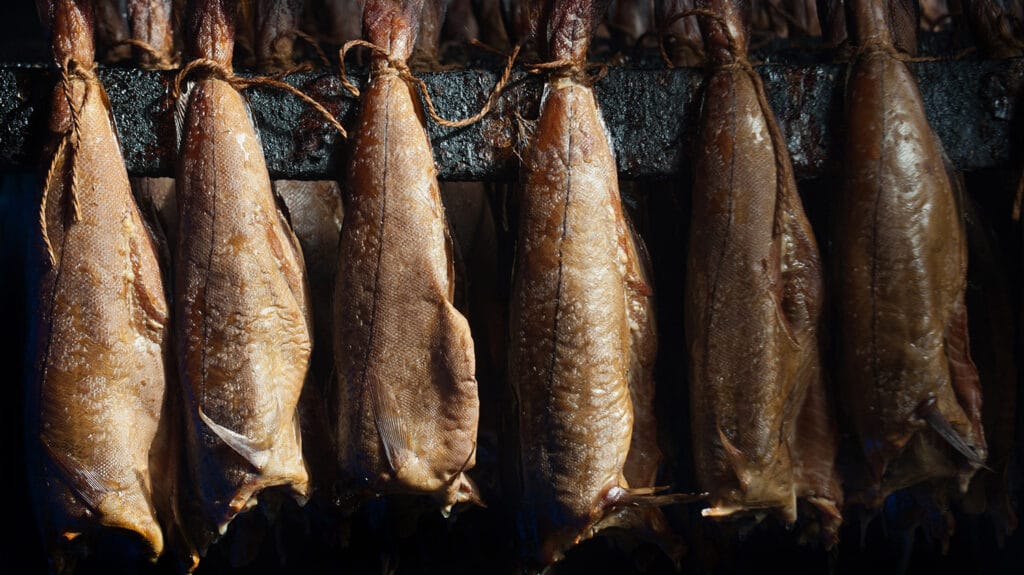 The fish are covered in salt, then pairs of them are tied together by the tail and hung up for about 24 hours. To smoke them, these pairs of fish are draped over metal rods that have been laid across the open top of a whisky barrel that’s had its top section cut off, with a fire burning inside.