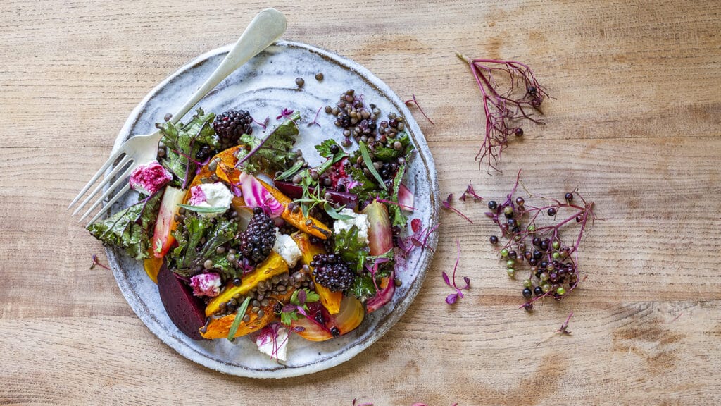 Now assemble your salad. Lay some raw and roasted beetroot on the plates along with the squash and crispy pumpkin seeds. Toss the kale with the lentils, herbs and some more of the vinegar place on top. Divide the goat’s cheese between the plates and dress with the blackberries and a little vinegar.
