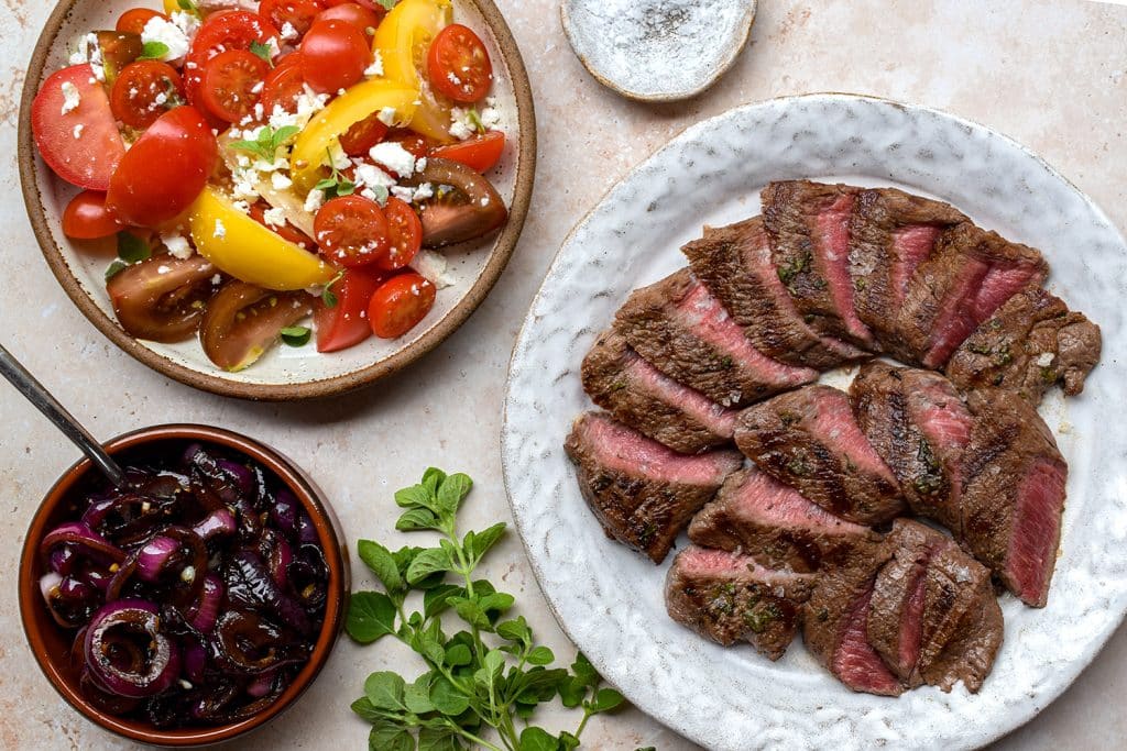 Barbecued cannon of lamb with tomatoes, ricotta & quick red onion pickle