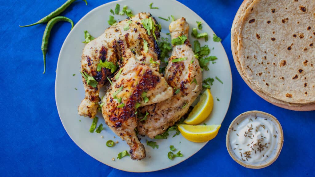 Barbecued chicken legs in a classic north Indian marinade of yoghurt, nuts and spices