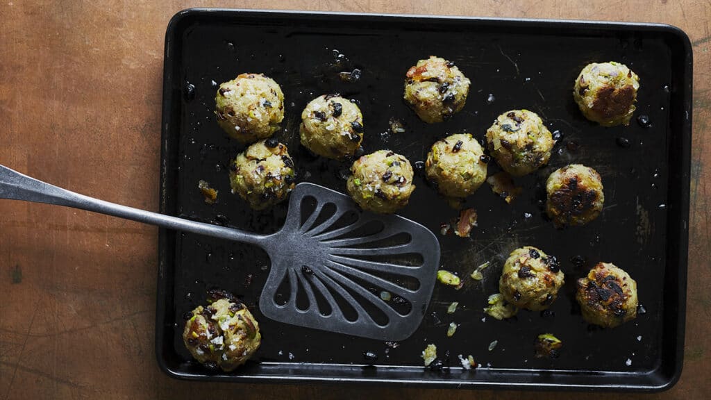Add the barberries, pistachios, apricots, breadcrumbs, egg, chilli flakes and a little salt. Mix well, then form into small walnut-sized balls. If you are having trouble forming the balls, add a little more egg and melted butter – the varying dryness of the breadcrumbs can mean slightly different amounts of moisture are required.