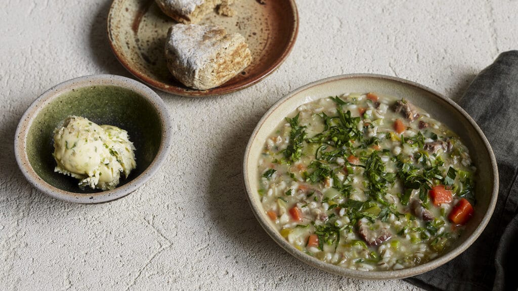 A hearty Irish broth with soda bread and whipped spring onion butter