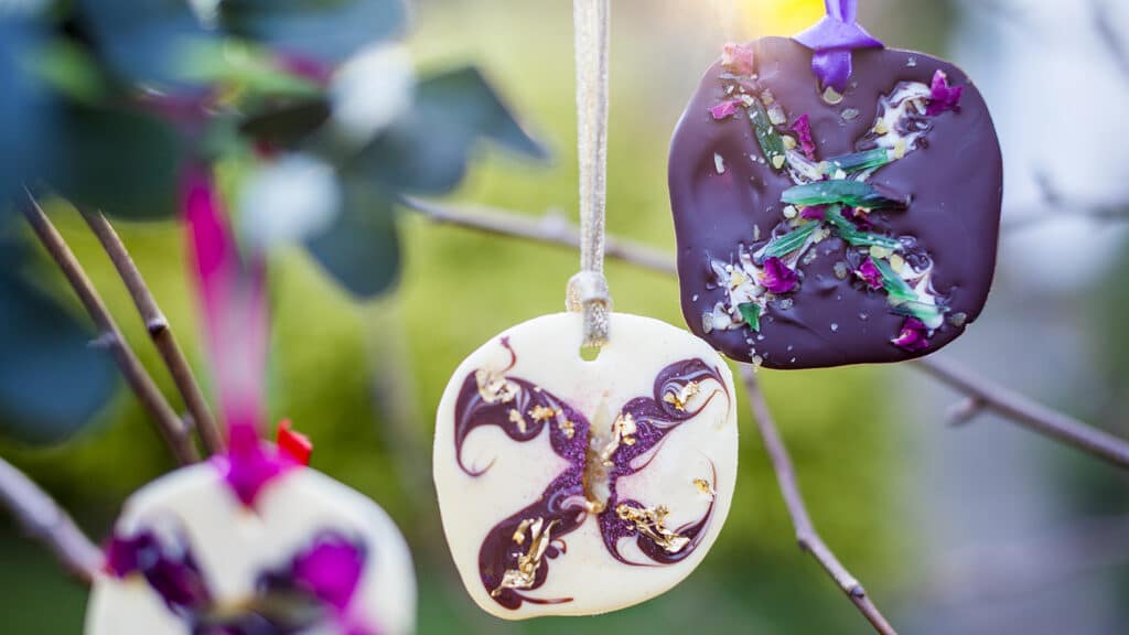 - Embellishments like gold leaf, petals, pistachio slivers, popping candy, candied peel, angelica