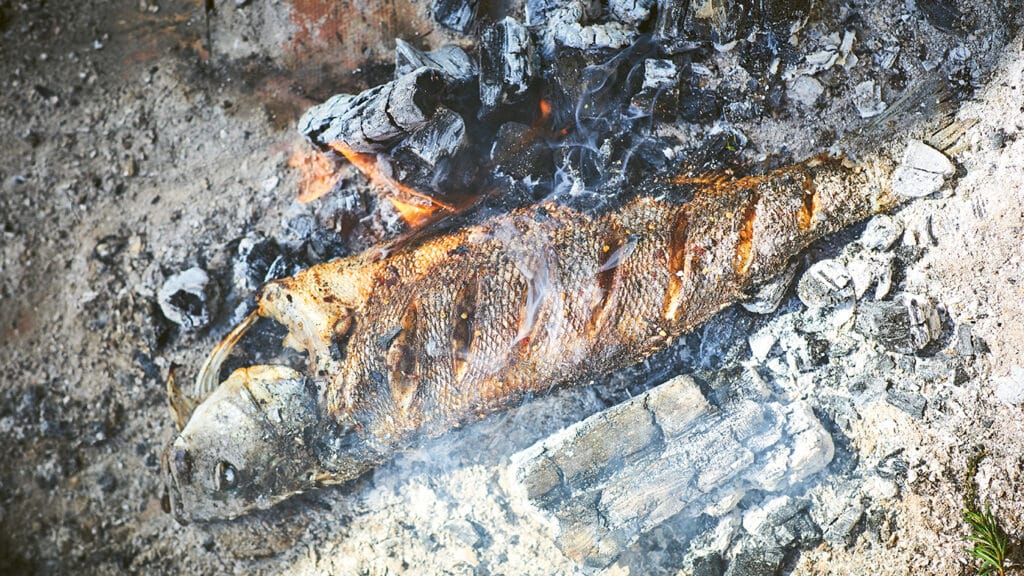 Place the fish in a fish cage or basket and grill for 5-8 minutes until the flesh is just cooked through and flakes when you pull it apart (it depends on the thickness of the fish and the heat of the grill so keep an eye on it).
