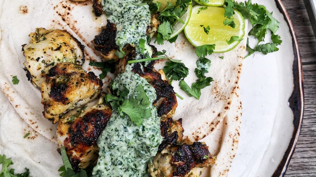Skewers of twice-marinated chicken thighs, charred on a barbecue