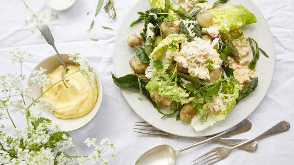 Spread the brown crab meat and apple mayo out on a platter. Top with the potatoes, lettuce, seaweed and asparagus, building up layers and seasoning as you go with salt, pepper and lemon. Top with the remaining mayo, followed by the white crab meat and soft herbs. Squeeze over a touch more lemon and dust with cayenne pepper.