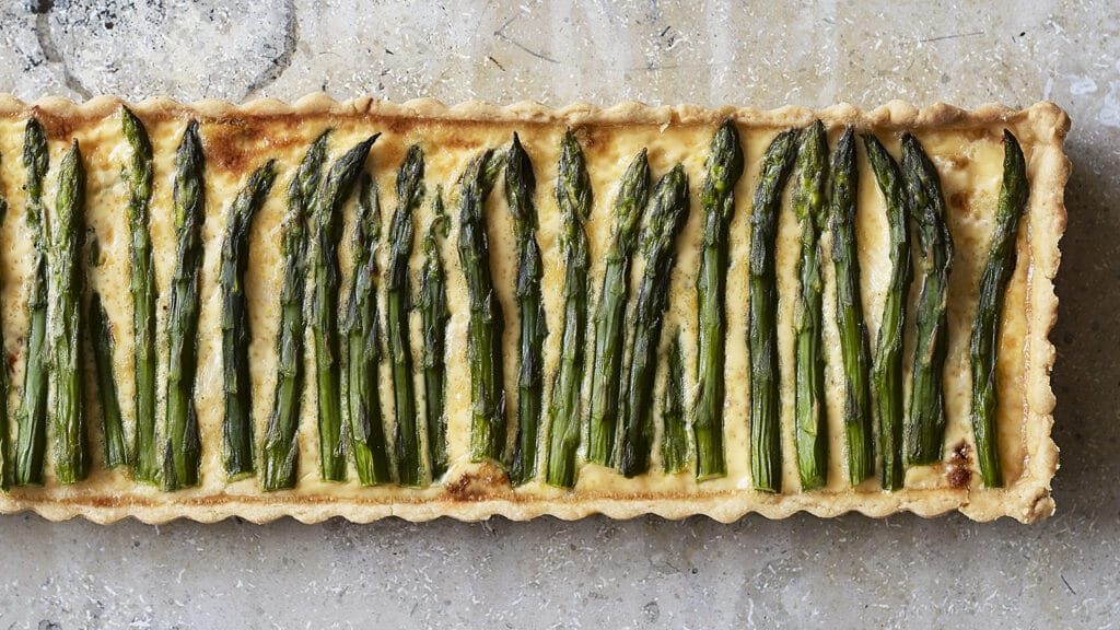 Turn the oven down to 180C. Cut the asparagus spears to fit the tart. Plunge into boiling water for about 1 min if pencil-thin and just 2-3 mins for finger-thick spears. Drain and refresh in a bowl of cold water.