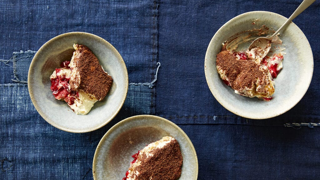 Repeat the biscuit soaking and arranging for a second layer. Cover with the remainder of the mascarpone, then refrigerate for 3 hours or more. Just prior to serving, dust with a final, generous teaspoon of cocoa powder, then use a fine microplane or similar to grate the chocolate over the top.