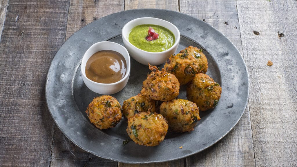 Take a heavy based pan, half fill it with sunflower or rapeseed oil and heat to 175C. Check the oil is hot enough by carefully dropping in a small spoonful of the potato mix – it should float to the surface immediately. Deep fry three or four balls at a time for 3-4 mins until golden. Remove with a slotted spoon and transfer to a plate lined with kitchen paper to drain the excess oil. Repeat until all the balls are cooked.