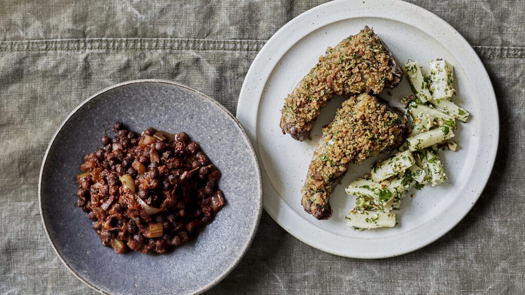 When the chops are rested, spread some of the onion puree onto the top and press on the crumbs. Serve with the parsley root and chickpeas.