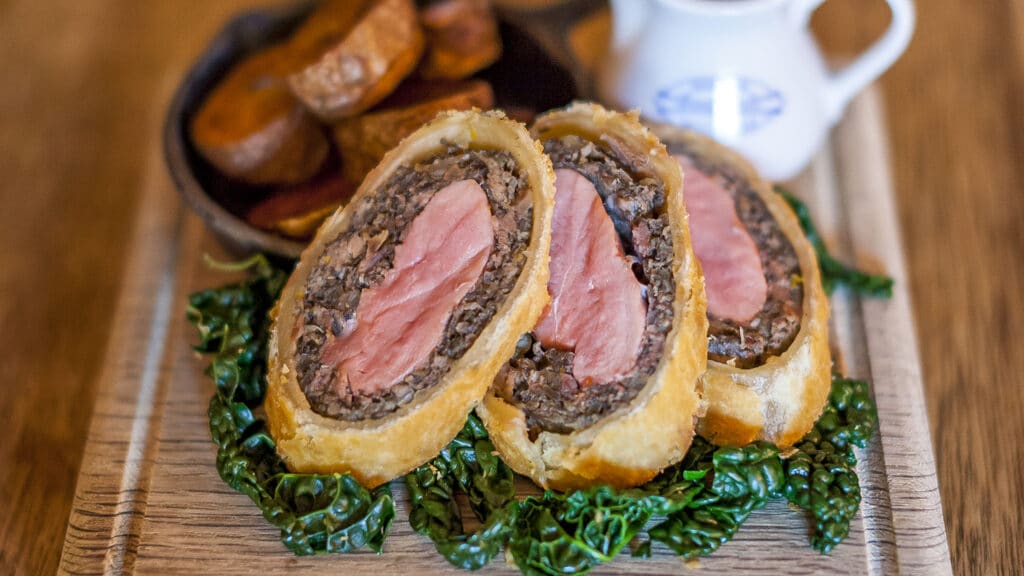 Duck breast, wrapped in confit duck and mushroom duxelles, wrapped in suet pastry