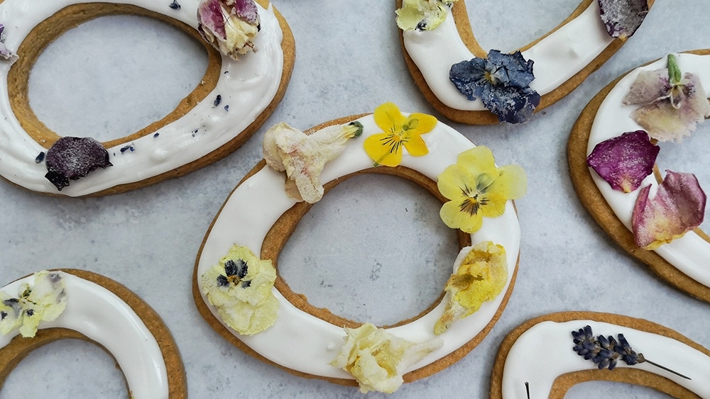 Eye-catching biscuits with sugary flowers and petals adding a floral crunch