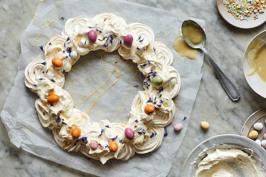 Place the star nozzle into the piping bag and add the meringue. To create a rose-like circular shape, hold the piping bag vertically directly over the tray and begin piping in the centre, then wind outwards from the centre to create a spiral. Stop squeezing the bag after a couple of rounds and pull the bag away from the tray. Repeat the circles until the tray is filled, creating a wreath-style Easter nest design.