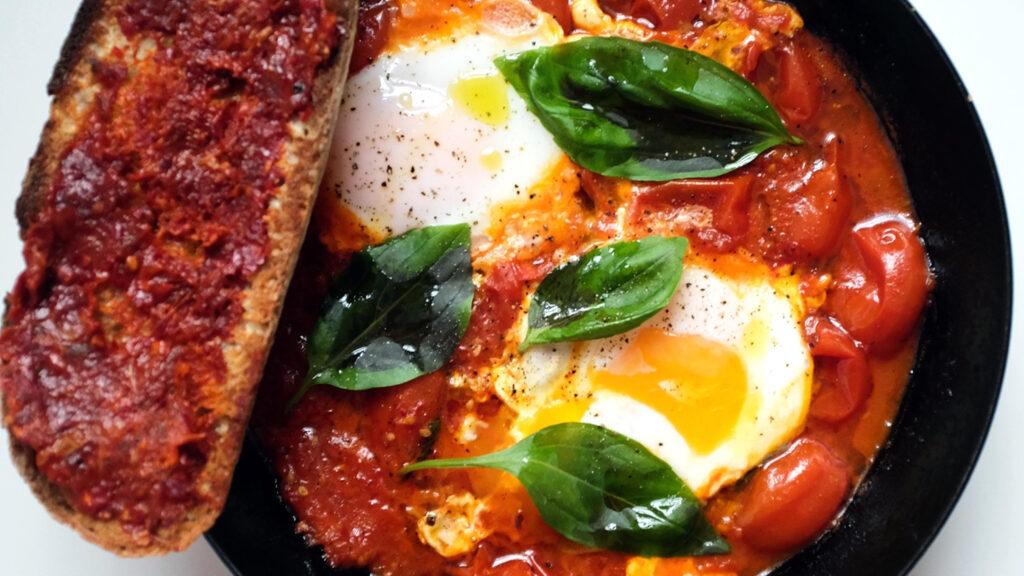 Once the basil leaves have wilted, create two (or four) areas for the eggs to be cooked in, by pushing the remnants of the tomatoes around. Crack the eggs in and put the lid back on top. Cook for 3 mins.