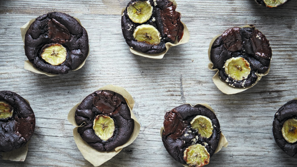 Fifteen-minute flourless choc chip banana muffins