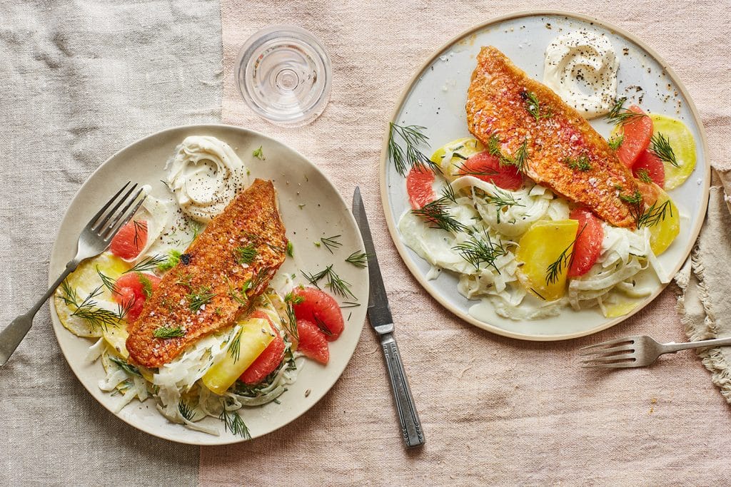 Segment the grapefruit by firstly paring away the thick skin and pith. Hold the fruit over the bowl containing the beetroot and fennel, and cut in between the pithy membranes, allowing the beautiful segments to escape into the bowl below. Squeeze out the left-behind pith. Toss in the fennel fronds and remaining toasted fennel seeds and set aside while you cook the mullet.