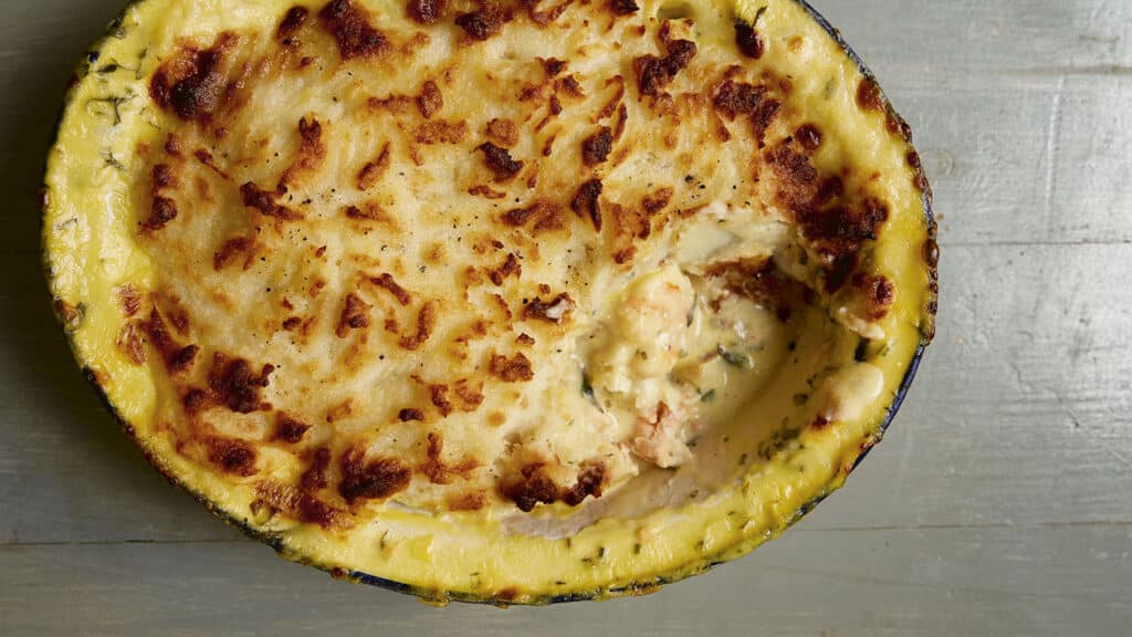 When you’re ready to cook the pie, preheat the oven to 210C. Spread the sauce over the fish and then top with the mash, making sure the potato is tight at the dish sides to help stop the sauce bubbling over. Fork the mash into little peaks. Sit the pie on a large baking tray that can catch any bubbling sauce and bake for about 30 mins (40-50 mins if the fish and sauce are being baked from cold). Your pie is ready when the potato is crisp and browned. If it is being slow to crisp, put under the grill for a minute or two, but keep close watch to make sure it doesn’t scorch.