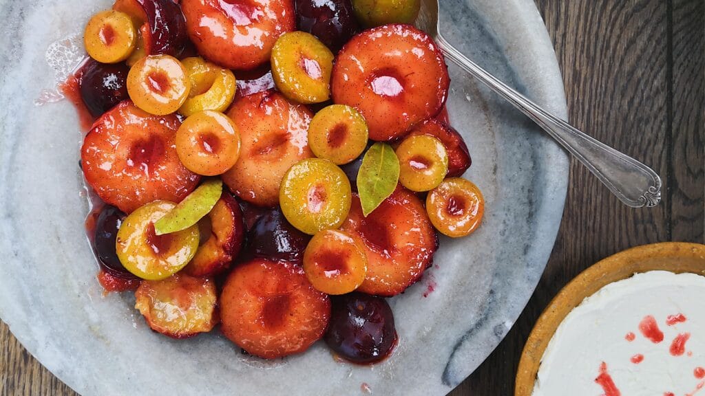 Carefully cut the vanilla pod in half and remove the seeds, then ripple them through the mascarpone. Over a low heat in a small frying pan just big enough to contain the plums, melt the butter with the caster sugar, the remainder of the vanilla pod and the fresh bay.