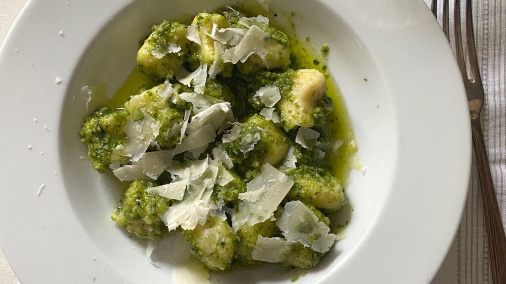 Homemade potato gnocchi with a pesto of walnuts and rocket