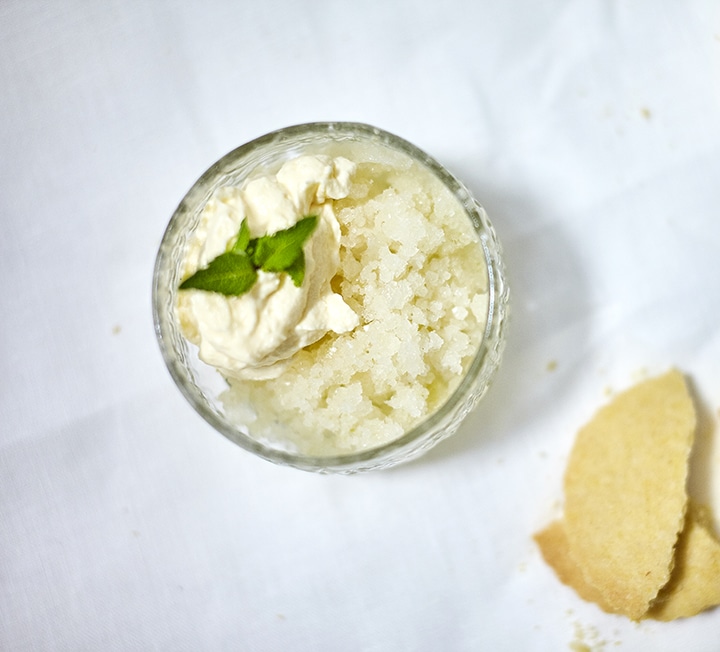 A crunchy, tangy ice served with a subtly floral cream and crisp little biscuits