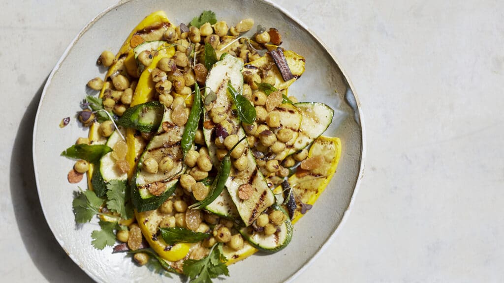 Place some of the courgette slices onto a serving plate, sprinkle with a few sea salt flakes and some of the spicy chickpeas, then scatter over some sultanas, fresh coriander and mustard shoots. Continue to layer the plate with courgette and chickpeas. Top with the fried curry leaves and chillies.