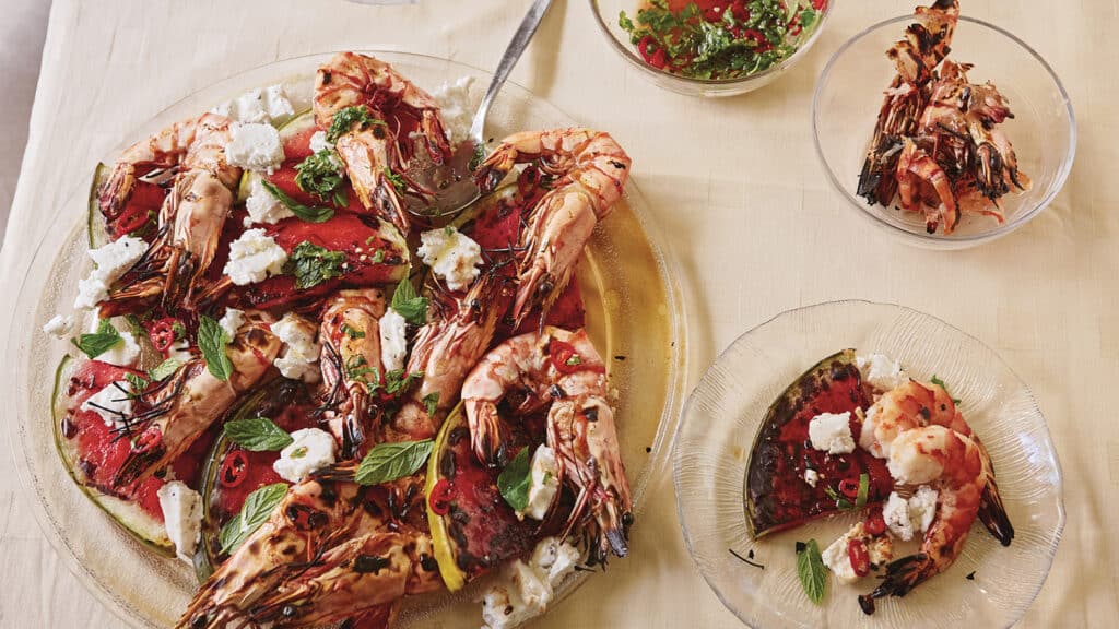 Start by grilling the watermelon – simply brush the pieces with some olive oil and lay them flat on the hottest part of the grill for about 1-2 mins each side. You want to form black grid marks on the flesh, as this will intensify the flavour and sweeten the fruit. Remove the melon to a side platter, then grill the prawns for 3 mins on each side (2 mins for smaller ones) or until they turn bright pink.