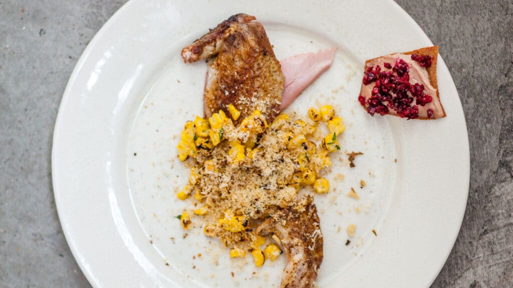 To serve, take the breasts from the bone and trim off any oxidised or grey meat. This can happen a lot – it’s basically where the flesh has come in to contact with the ruptured insides of the bird. It will taste unpleasant, and we don’t want that!