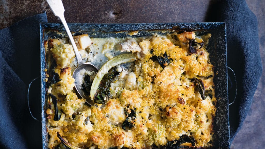 Check the fish for bones then cut into 3-4cm chunks. Combine the fish chunks and the drained and cooled broccoli with the creme fraiche (it might not seem as though there’s enough sauce, but it will thin out as it cooks). Transfer the fish and broccoli to an ovenproof dish, ideally snug enough for the fish and broccoli pieces to sit in two layers. Ensure the different components are evenly distributed, particularly the leaves.