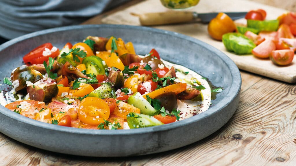 Chunky, sharply dressed tomatoes, served on top of whipped tahini