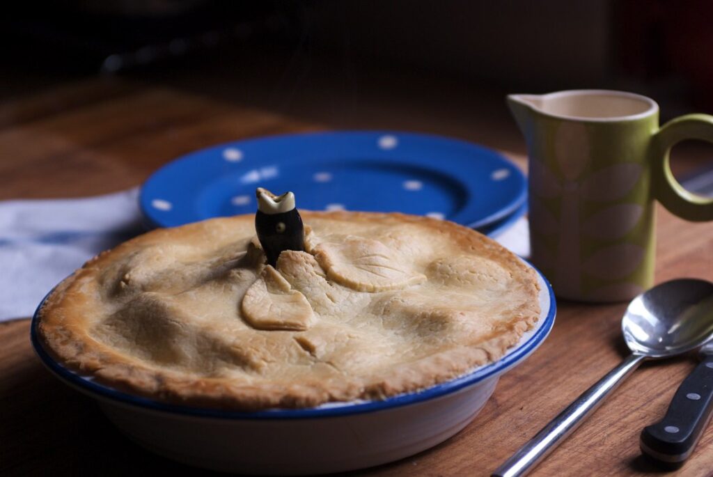 Slice the cheese finely and cover the apples with a layer of cheese. Now roll out your pastry and cut a small cross in the middle if you have a pie funnel. Lift the pastry onto the pie using a rolling pin, don’t worry about any cracks, a few pastry leaves seem appropriate in any case, and will cover a multitude of sins.