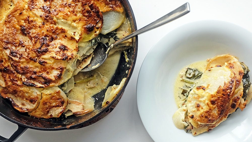 Wash the spinach thoroughly, remove and discard the stalks and chop the leaves in half. Put the cream, milk, 1 tsp mustard and a good pinch each of salt and white pepper in a milk pan and warm to a gentle simmer while you assemble the gratin.
