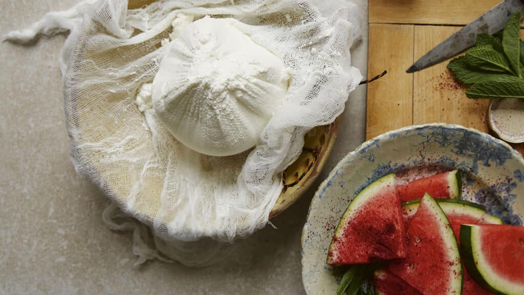 Sit the watermelon pieces on the labneh and pour over the dressing. Chop the mint and scatter over, then finish with a grinding of black pepper.