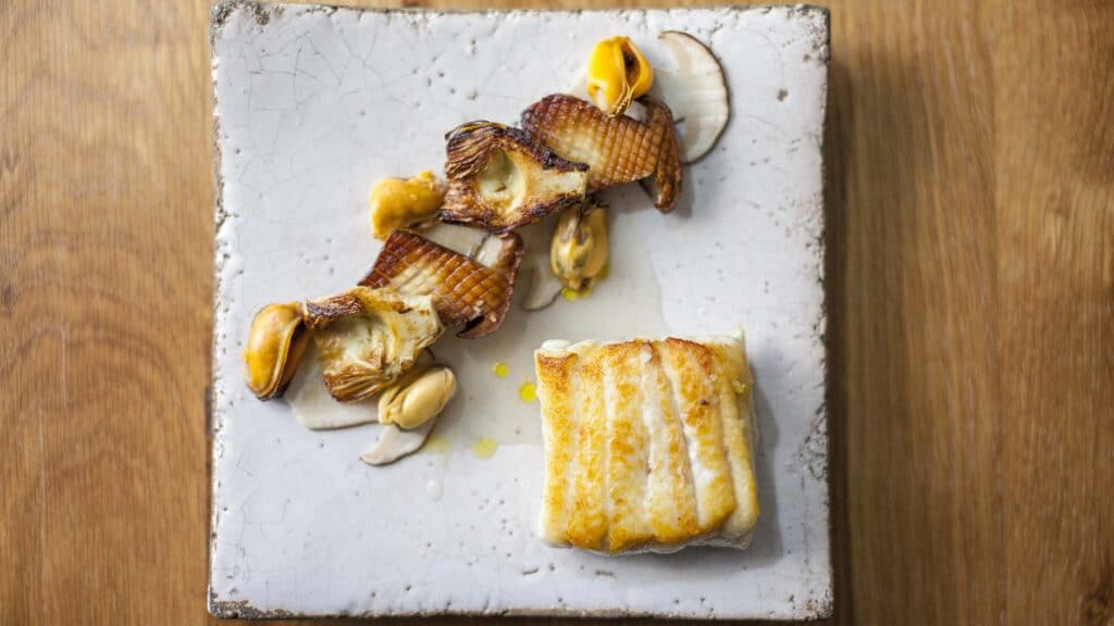 Remove the cocktail sticks and plate the fish with the artichokes, mussels and porcini, using a little of the mussel stock as a broth on the bottom of the plate.