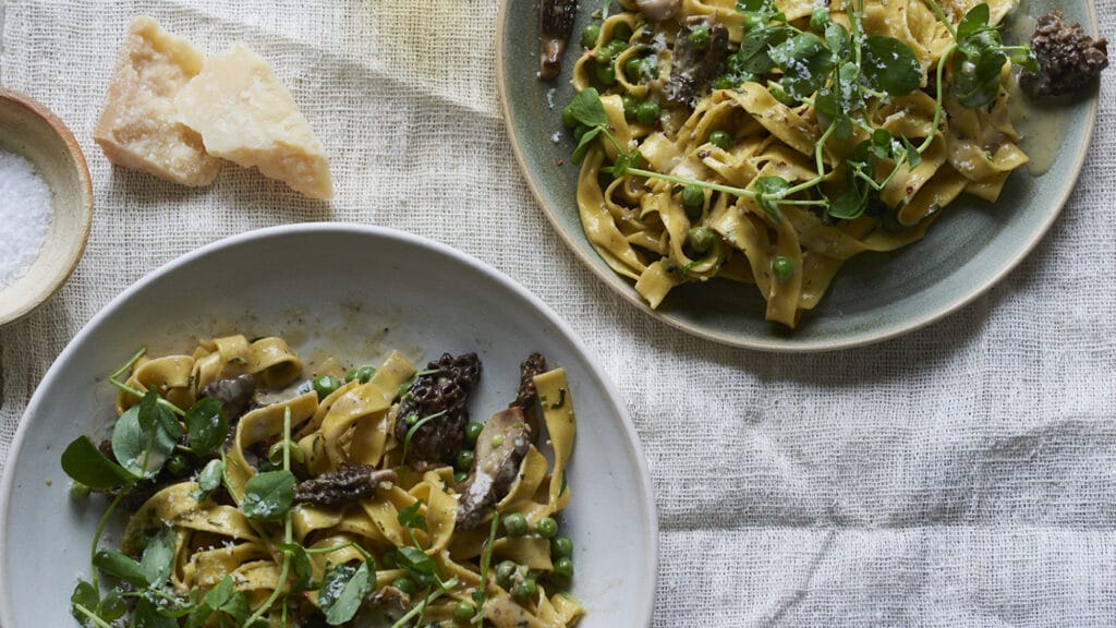 Put a pan of heavily salted water on to boil. Wipe out the skillet and return it to a medium heat, then add the butter and a further 1 tbsp olive oil. Fry the shallot, lemon zest, peppercorns and garlic for a few minutes, until softened and aromatic, then add the cream. Return the morels and peas to the pan, tossing to coat with the sauce.