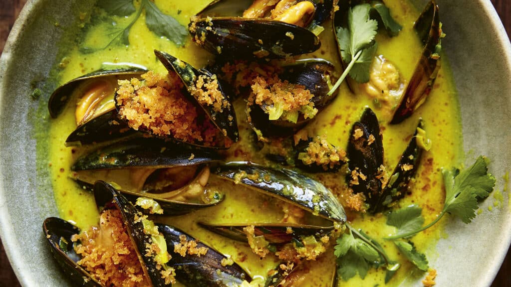 Increase the heat and add the mussels. Put the lid on the pan and let them cook, undisturbed, for 4 mins. While that is happening, heat the remaining tablespoon of ghee or oil in a small frying pan over a medium heat, add the panko breadcrumbs with the chilli flakes and toss around until nicely golden. Tip into a bowl.