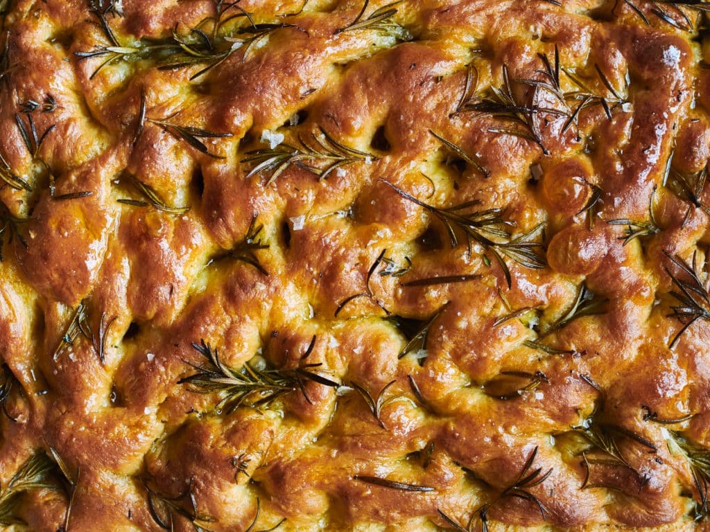 Just before baking, poke a few dimples into the surface, sloshing over some more olive oil and dot with coarsely ground or flaked sea salt. Bake for about 30 mins until light golden brown and then splash with a little more oil as it cools. Focaccia freezes well – when serving, just flash it into a hot oven from frozen. By the time the crust has crisped, the dough will have thawed inside.