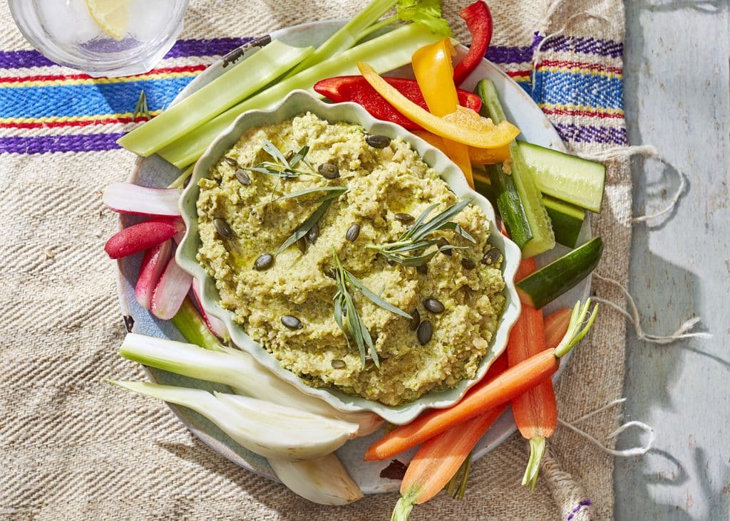 In a small blender or grinder, blitz the preserved lemon and honey with a splash of water to create a fine paste. Ripple the fresh green dip with the preserved lemon, drizzle with olive oil, then garnish with pumpkin seeds, tarragon and more preserved lemon if you like. Serve with an abundant selection of seasonal crudites.