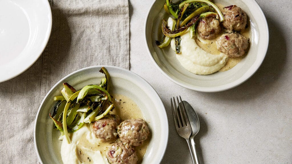 Meanwhile, find a saucepan or sauté pan large enough to hold the meatballs in one layer. Place over a low-medium heat and briefly warm 1 tbsp light olive oil. Add the shallot and a pinch of salt. Soften for 3 mins without browning, stirring occasionally. Add the garlic and cook for 1 min more. Increase the heat, wait for 10 seconds, then pour in the stock. Reduce by a quarter, then stir in the creme fraiche and turn down to a very gentle simmer. Add the meatballs and tarragon and simmer for 10 mins more.
